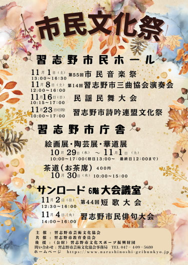 | 民謡民舞大会 | 11月5日(日) | 習志野市民ホール | 習志野市民謡民舞連盟 |
